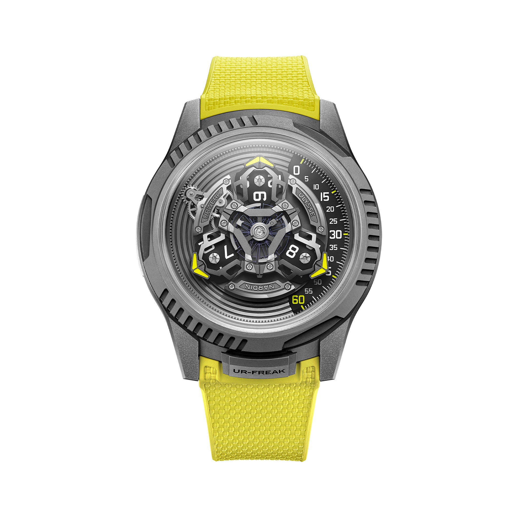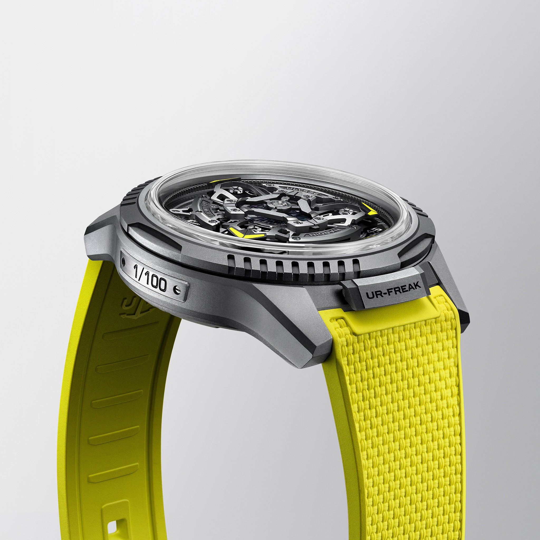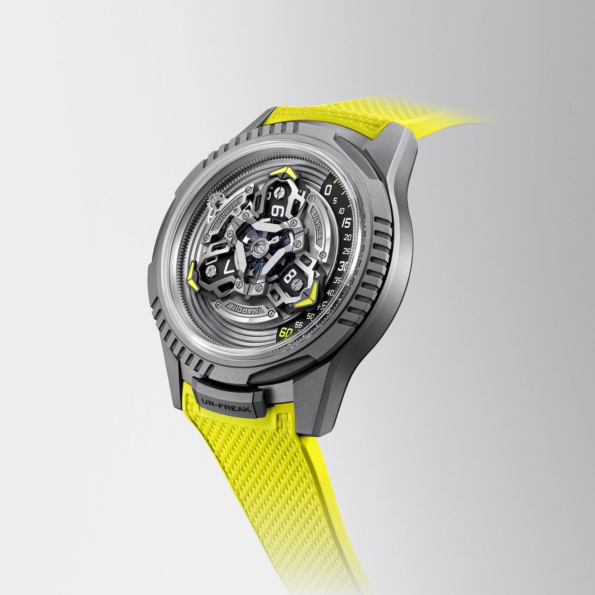 The UR-FREAK is a limited-edition reimagining of Ulysse Nardin’s Freak, considered by many to be one of the most important contemporary contributions to horology. The UR-FREAK was designed in collaboration with the imaginative minds of two pioneering independent Swiss watchmakers. URWERK and Ulysse Nardin who are vanguards in their own respect and worked together for the first time to create the UR-FREAK. Limited Edition of 100 pieces