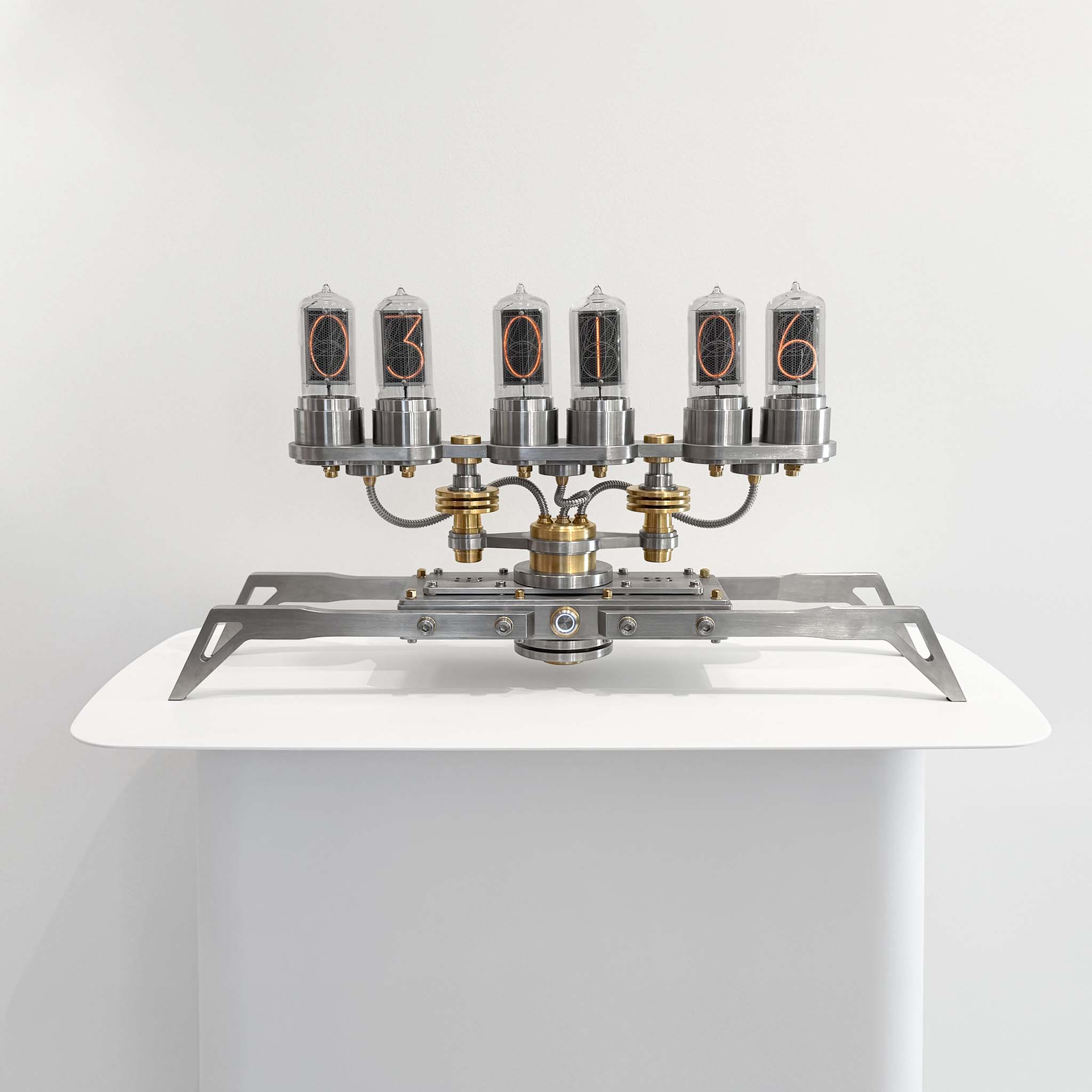 The Time Machine 01 clock is the newest evolution in the work of Frank Buchwald. Each and every detail has been manually handcrafted: from design, construction, and detailed workmanship of the clock to the six Nixie tubes fabricated by Dalibor Farny. The Time Machine 01 consolidates Frank Buchwald’s design and structural principles into a futuristic work of art whose dynamic emphasis is dominated by the machine-like character of the design: the form is compact and vigorous and the proportions perfectly executed.