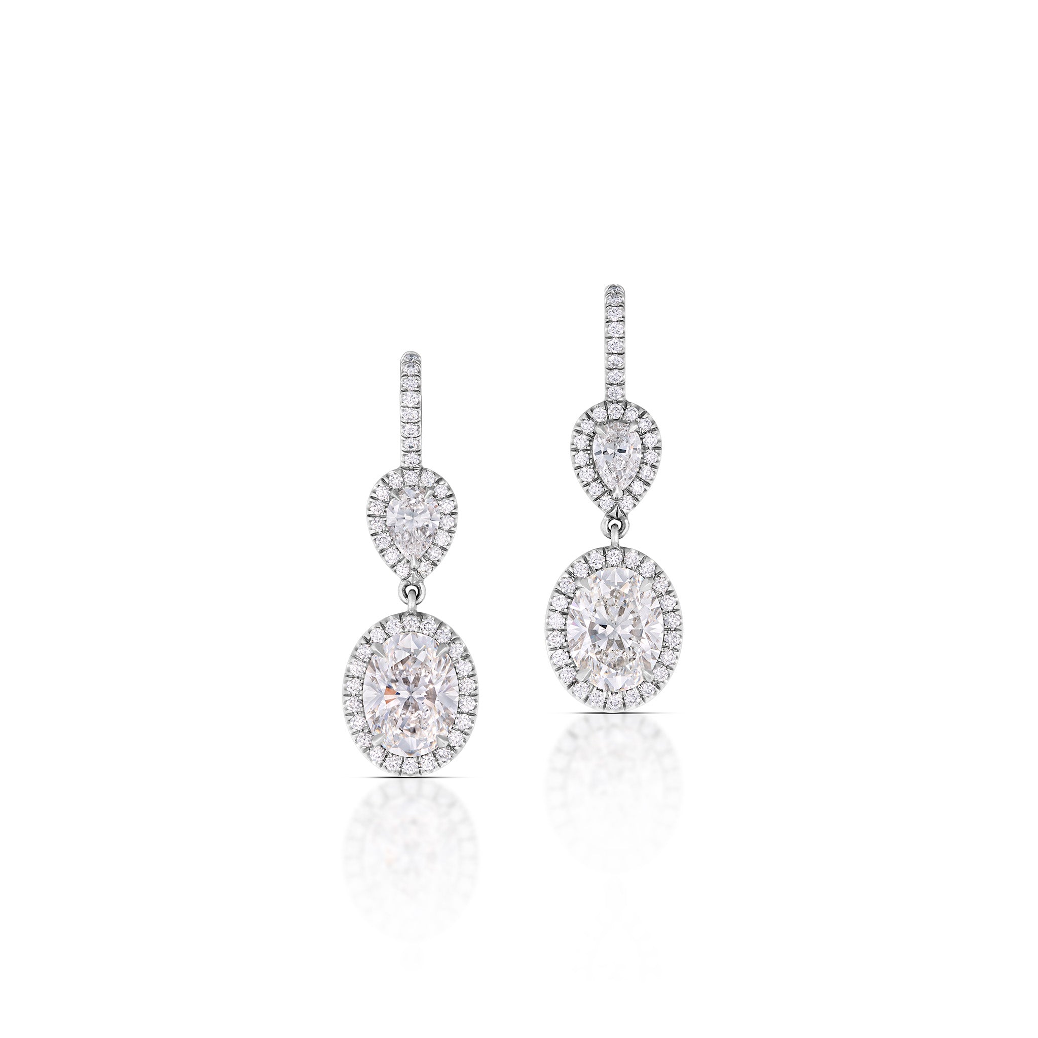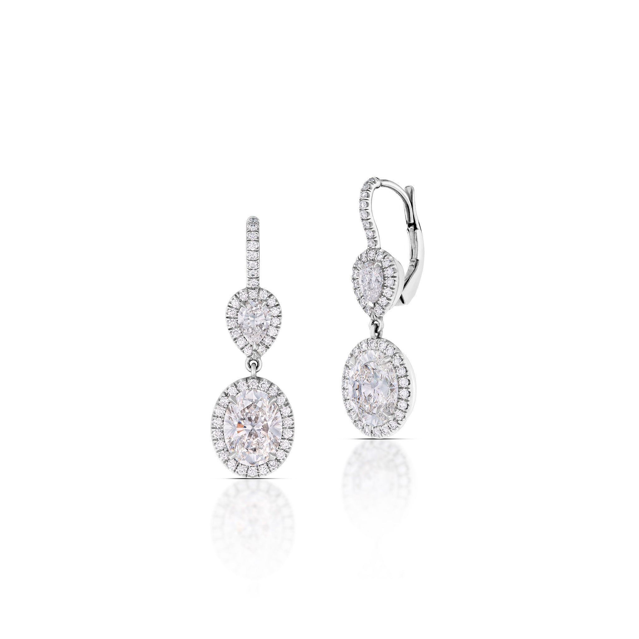 Crafted in platinum and 18K white gold, these elegant diamond earrings feature two oval brilliant-cut diamonds weighing approximately 1.63 carats (F color, VVS2 clarity) and 1.60 carats (G color, VVS2 clarity). The diamonds are accented by 88 additional diamonds totaling approximately 0.46 carats. Finished with secure 18K white gold lever-back closures.