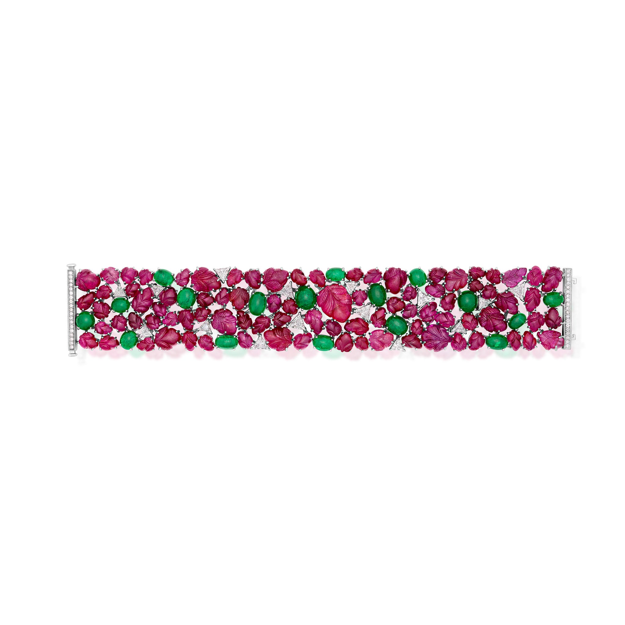 A true statement piece, this platinum "Tutti Frutti" style bracelet is comprised of 167.31 total carats of richly red carved rubies, 27.17 total carats of juicy cabochon cut emeralds, and 4.47 total carats of sparkling trillion and round brilliant cut diamonds.
